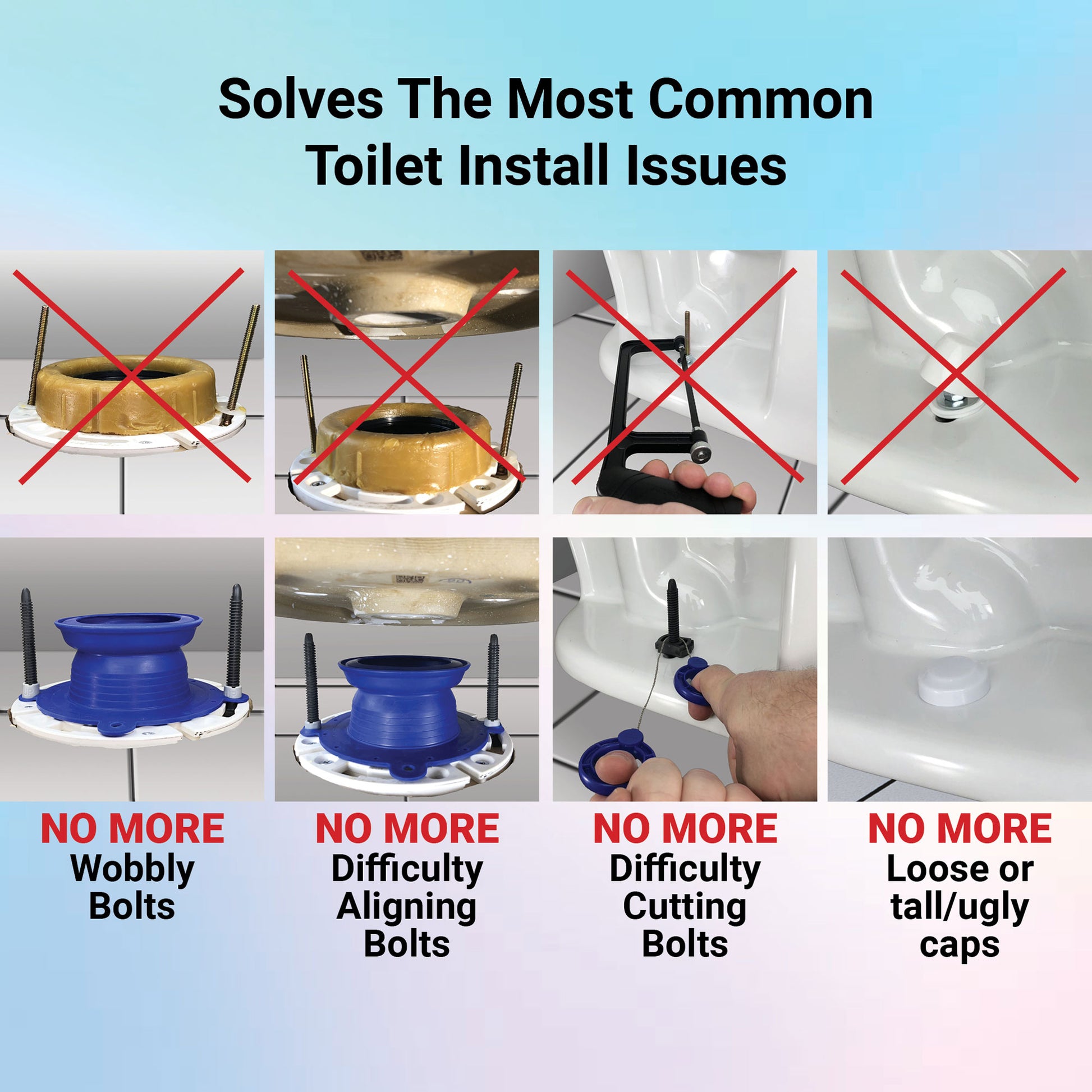 Easy Install | Toilet Bolts Lock to the Toilet Flange (Centering the Seal & Toilet). Bullet Tips Guide Bolts Through the Small Toilet Openings,