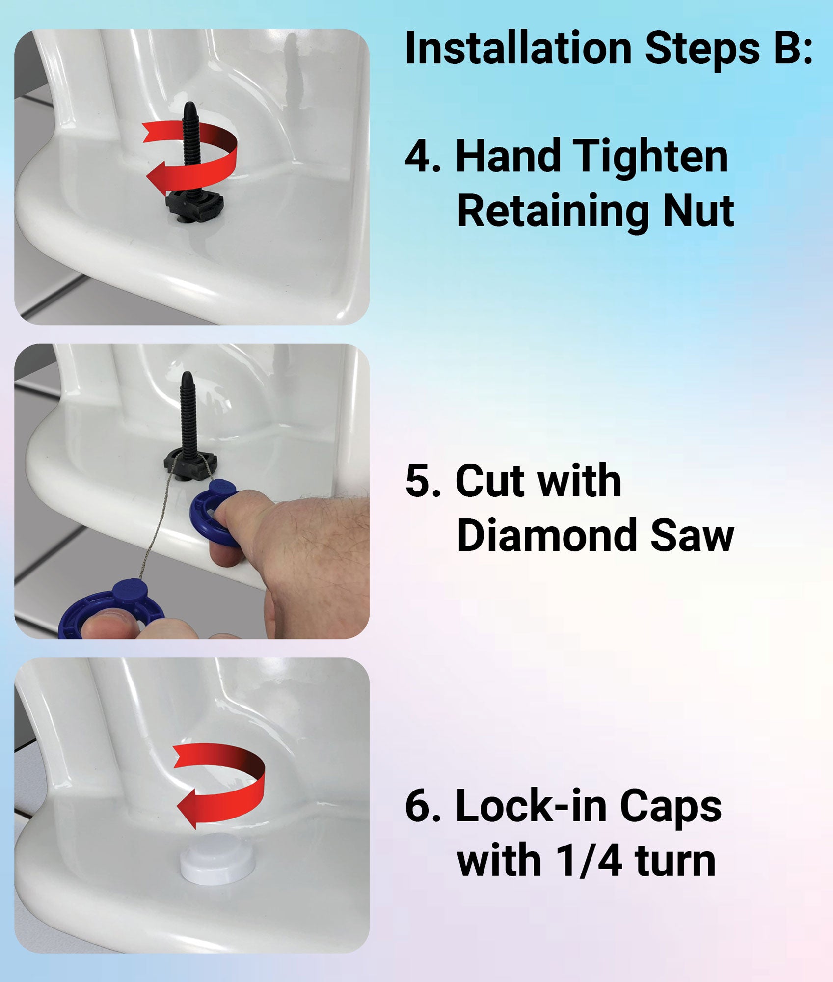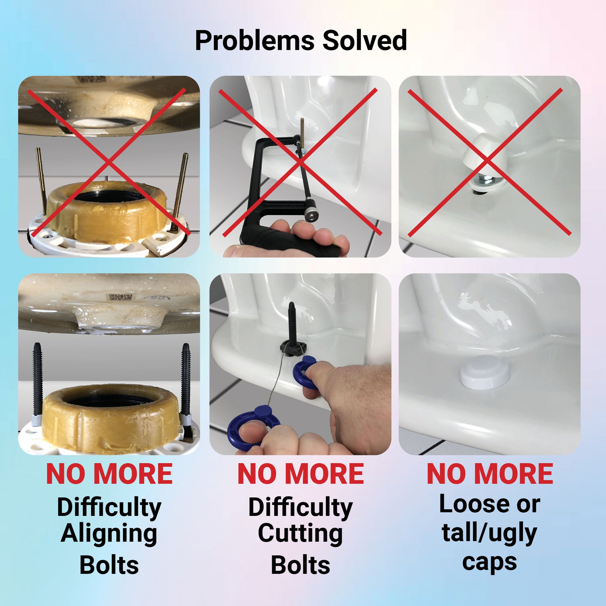 TOILET REPAIR KIT INCLUDES: One-N-Done Premium Toilet Bolts w/ Lock Nuts), Tool-Free (Retaining Nuts), Cut-in-Seconds (Diamond Saw), and Low-Profile (Locking Toilet Bolt Caps).